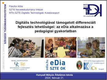 2024. február 24. Pásztor Attila kollégánk "Digitális technológiával támogatott differenciált fejlesztés lehetőségei: az eDia alkalmazása a pedagógiai gyakorlatban" címmel előadást tartott az Oroszlányi Hunyadi Mátyás Általános Iskolában.