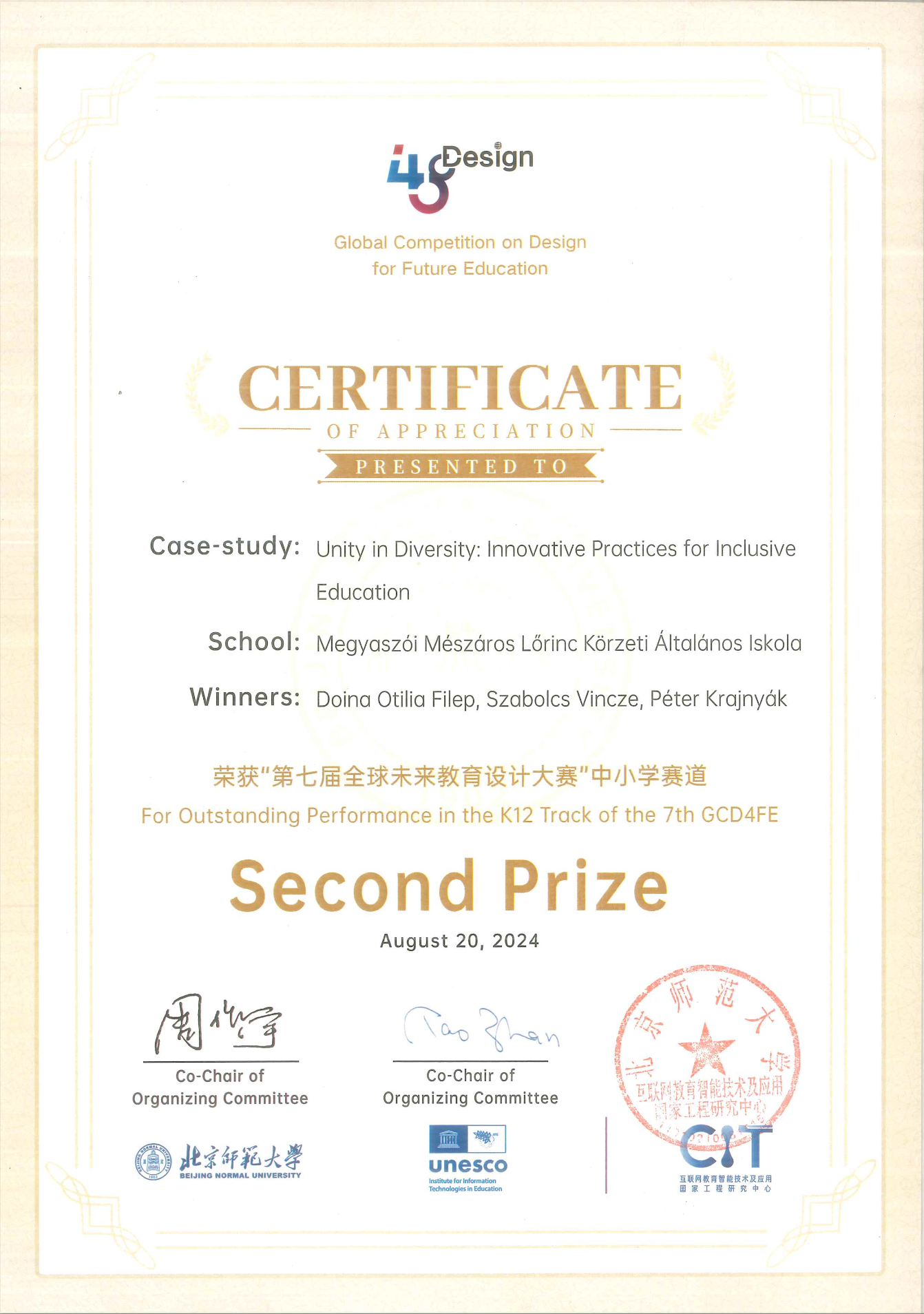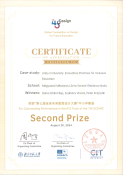 2024. augusztus 20. Gratulálunk! Filep Itilia, Vincze Szabolcs, és Krajnyák Péter a Szerencsi Tankerület Központ Megyaszói Mészáros Lőrinc Körzeti Általános Iskolát képviselve, az első magyar csapatként, nívós 2. helyezést értek el a "Global Competition on Design for Future Education" megnevezésű világversenyen Pekingben, K12 kategóriában. Pályamunkájuk címe: Unity in Diversity: Innovative Practices for Inclusive Education.